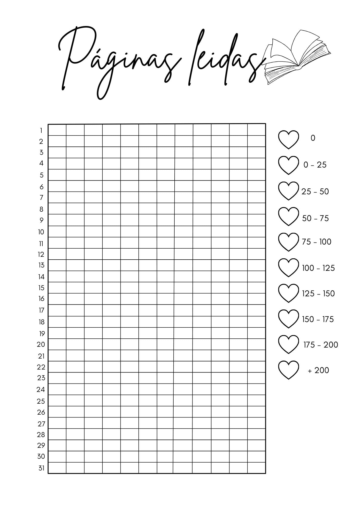 - Tabla de páginas leídas para anotar cada día cuánto has leído usando una guía de colores
